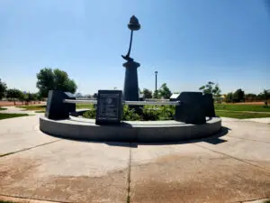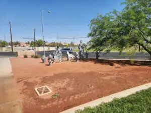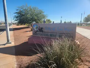 Firefighters Memorial Park is just east of Rainbow, south of Oakey, in 89146. The park is about half a mile square, anchored with firefighter sculptures and the memorial in the northwest corner. It has drinking fountains near the children’s playground, but no bathrooms. To the east is a flood reservoir. Doing a loop around the exterior of the park and the reservoir gives you a mile run.